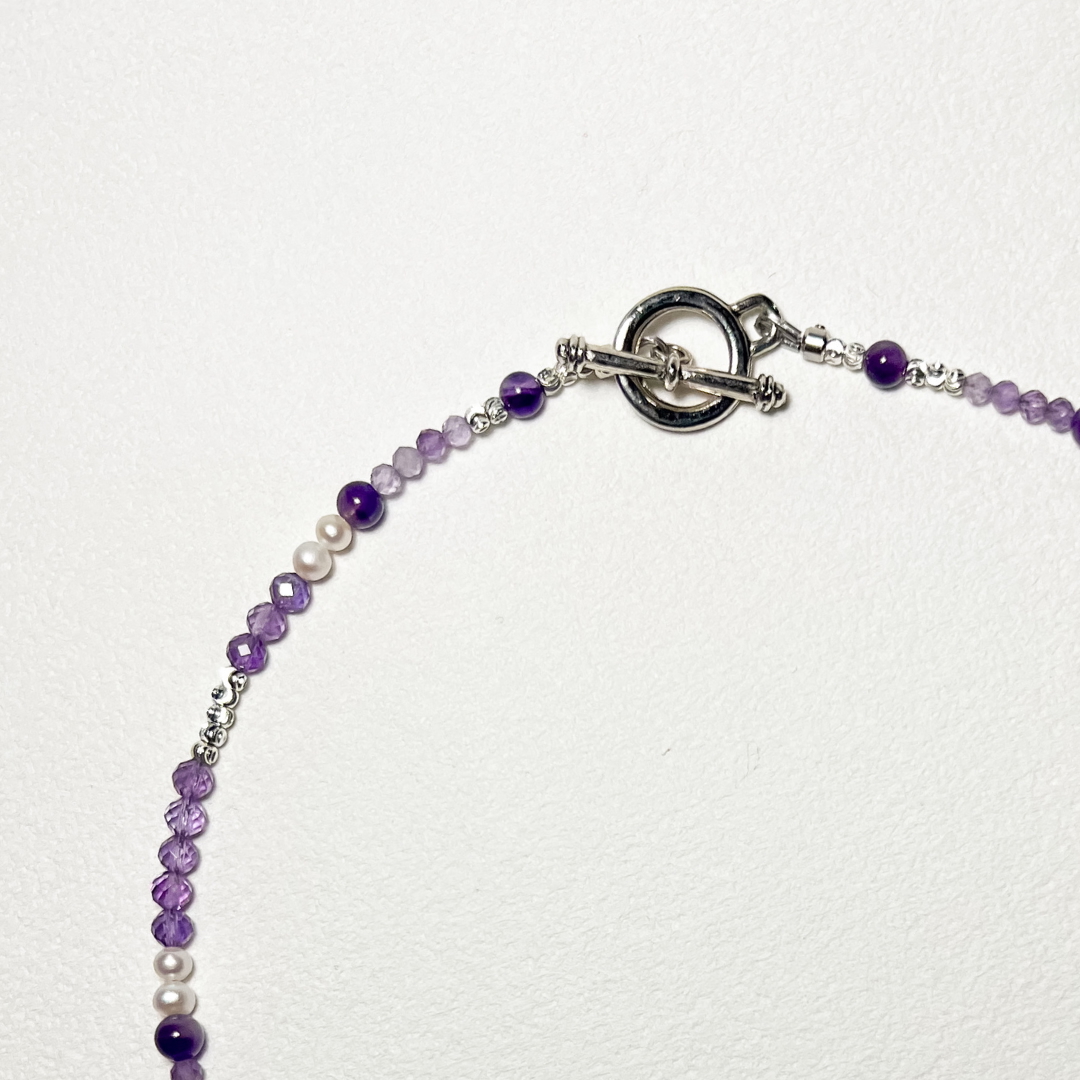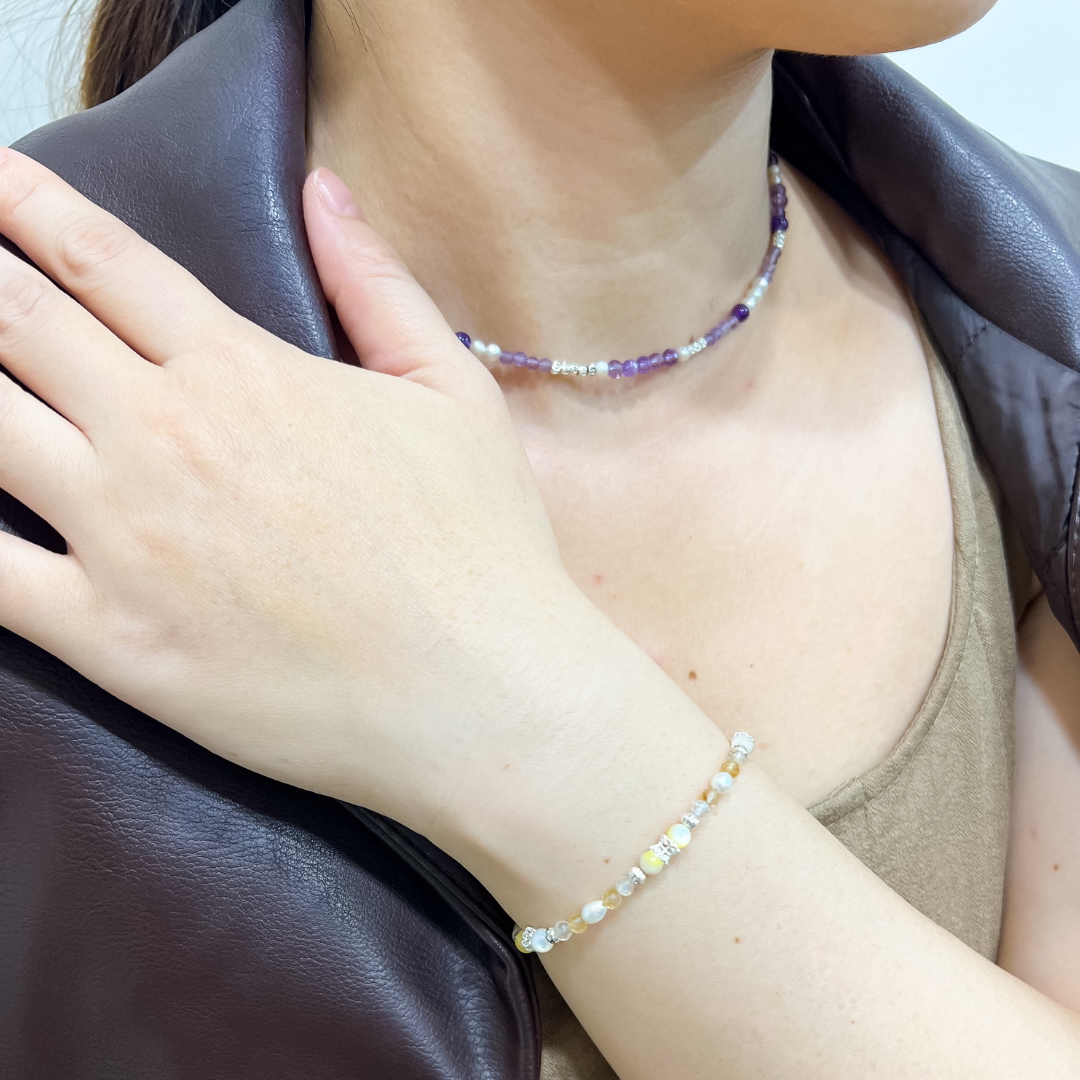 紫超七珠徑 4 mm、紫水晶珠徑 2-3 mm、淡水珍珠珠徑 4 mm